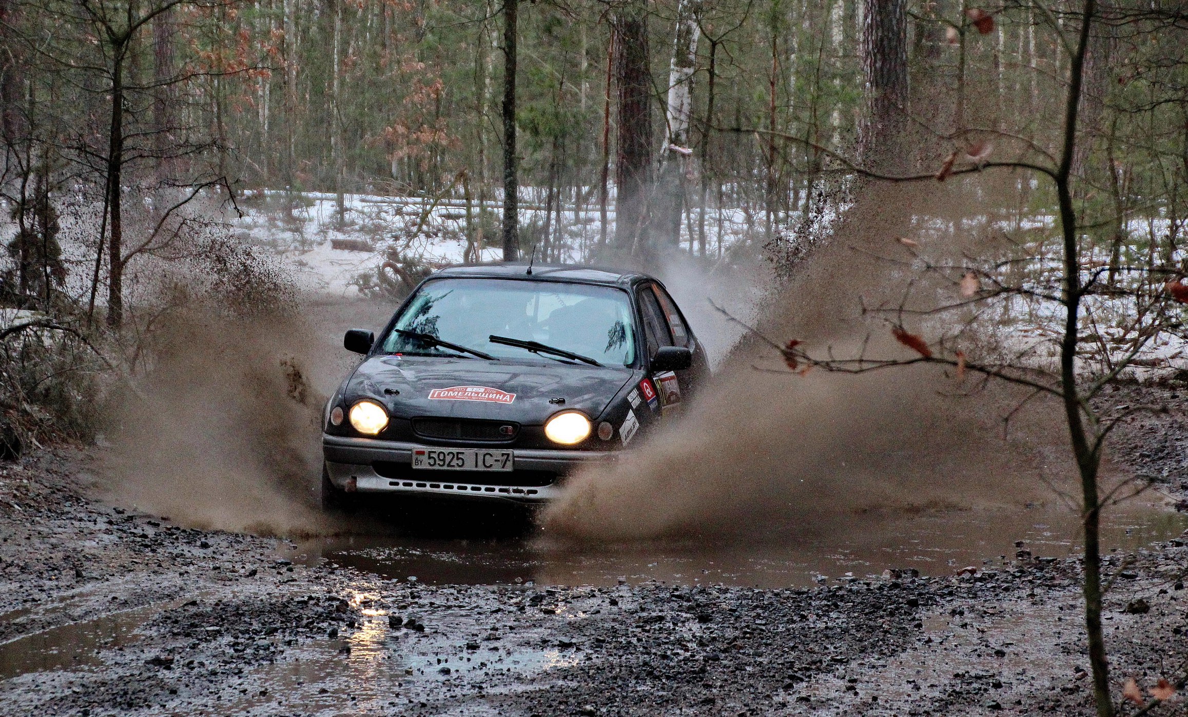 Зимняя Гомельщина (на фото выше) больше напоминала или весну, или осень, с раскисшими дорогами, лужами на спецучастке, который, к слову, был незнаком большинству ралллистов, приехавших туда для участия в ралли-спринте "Гомельщина -2015". Большинству - но не всем. Для экипажей из Гомеля Юрия Семенчука на Ford Fiesta и Виталия Крупенько на Renault Megane эта трасса считалась "домашней". Для нашего же экипажа, выступавшего всего второй раз в жизни - любой спецучасток - это целое открытие :).Настолько узко было в гомельском лесу (точнее, это был Лоевский район, деревня Рудня-Каменева, 50 км от Гомеля на юг на территории Днепро-Сожского заказника) - настолько мы пытались ехать аккуратно, чтобы не задеть ни одно из многочисленных деревьев. Удалось записать онборды, по которым можно видеть, насколько там узко и страшно ехать. Их можно посмотреть в Галерее.Закончилось ралли победой экипажа Синебок/Вихренко в абсолюте, который на одном из проездов неожиданно вылетел с трассы, "промазав" мимо поворота (видео ниже): Мы неплохо проехали всю гонку, у нас были неплохие времена, и со стороны, по словам зрителей, мы смотрелись также нормально. Такие спецучастки в первую очередь требуют водительского мастерства, и мощность машина на таких допах роль играет значительно меньшую - поэтому от "мощных" лидеров нас отделяло меньше минуты, потому что приходилось петлять и маневрировать на узком допе, прямиков там было немного.Подробнее о гонке - в Автобизнесе:Фото, которое удалось собрать, находится в Галерее.P. S. Мы остались под приятным впечатлением от того, что Форд не "глючил", от большого количества зрителей и организации мероприятия, награждения по возвращении в Гомель на территории картингового центра, пресс-конференции победителей, и большого количества фото- и видео материалов, оставшихся после гонки.